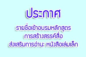 ประกาศรายชื่อผู้เข้าอบรมหลักสูตรการสร้างสรรค์สื่อส่งเสริมการอ่าน : หนังสือเล่มเล็ก