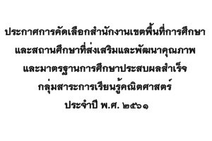 ประกาศการคัดเลือกสำนักงานเขตพื้นที่การศึกษา และสถานศึกษาที่ส่งเสริมและพัฒนาคุณภาพและมาตรฐานการศึกษาประสบผลสำเร็จ กลุ่มสาระการเรียนรู้คณิตศาสตร์ ประจำปี พ.ศ. 2561