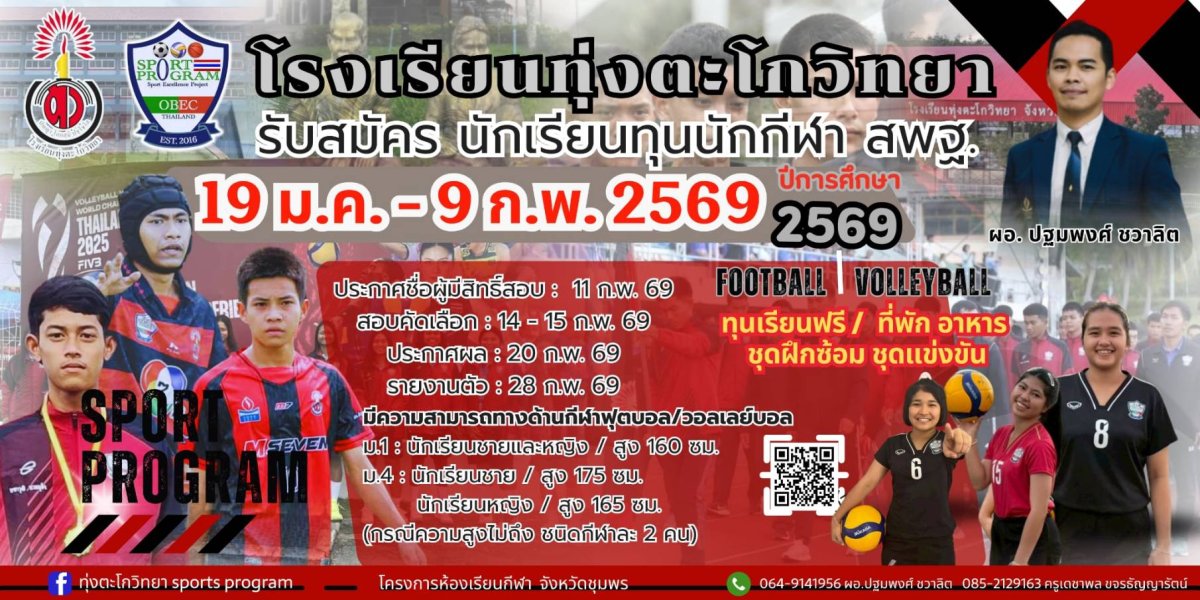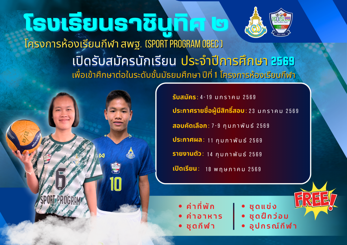กำหนดการรับนักเรียนโครงการห้องเรียนกีฬา ประจำปีการศึกษา 2569